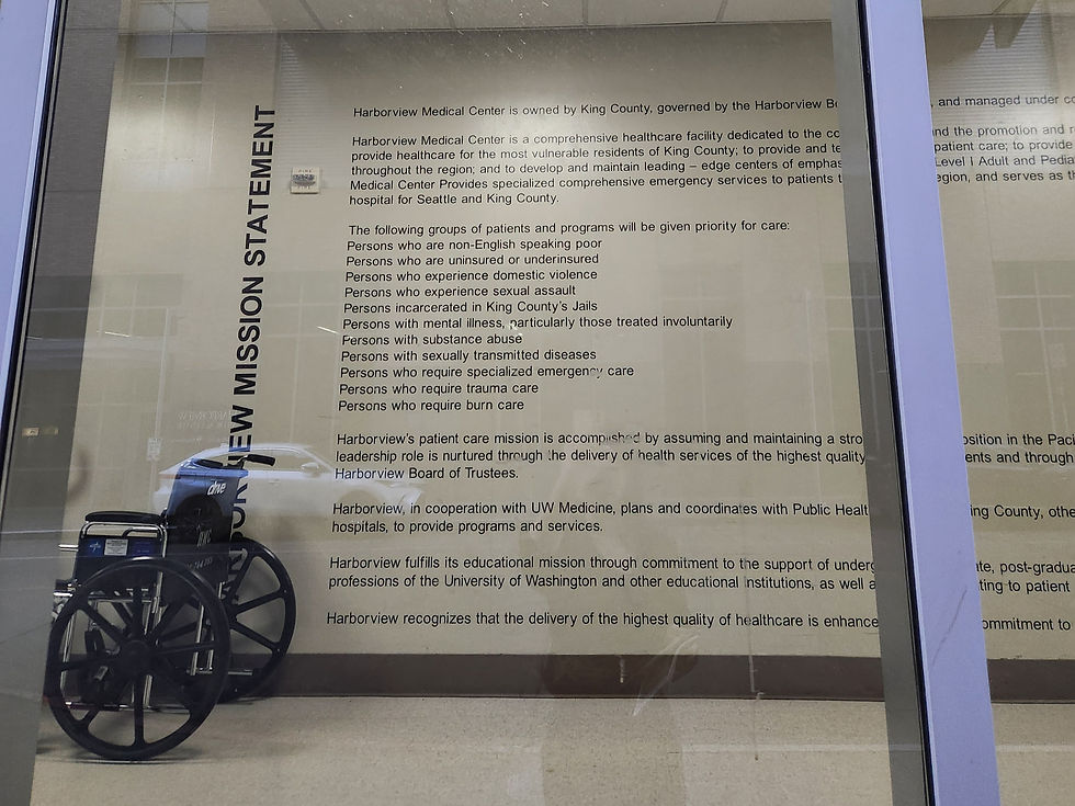 This is Harborview's mission statement. It outlines their goals, values, and history. They treat many populations that often struggle to find care or are turned away at other medical facilities. In a society of privatized healthcare and limited access, Harborview is akin to a sanctuary for those in need.