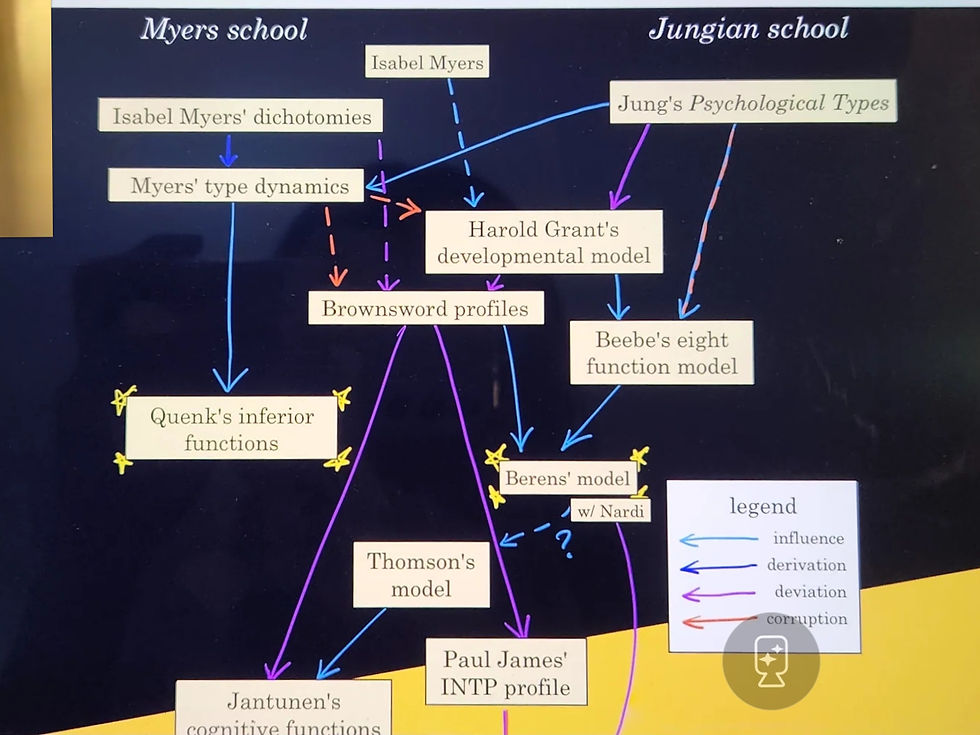 I found that the MBTI test had many influences, as shown in the picture above, but it was primarily inspired by Carl Jung's Psychological Types, where he describes four main psychological functions: thinking, feeling, sensation, and intuition. He states that there is one dominant function, two auxiliary functions, and one inferior function. This differs significantly from the more simplistic dichotomies of the Meyers-Briggs model. Additionally, the Meyers-Briggs model is meant to be an assessment of overall personality traits, which can fluctuate depending on the situation. Jung's model refers specifically to the cognitive processes within a person's psyche, which stay the same throughout a person's life.
